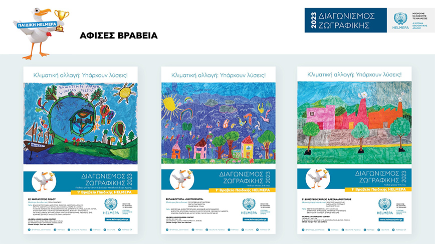 Τα έργα που διακρίθηκαν με το Α’ Βραβείο αποτελούν τις κεντρικές αφίσες της HELMEPA για την ευαισθητοποίηση του ευρύτερου κοινού και θα είναι διαθέσιμες για το σχολικό έτος 2023-2024, σε όλα τα σχολεία της χώρας, μέσω του πανελλήνιου δικτύου της παιδικής HELMEPA, μεταφέροντας τα αισιόδοξα μηνύματα των παιδιών-μελών της για την αντιμετώπιση της κλιματικής αλλαγής.