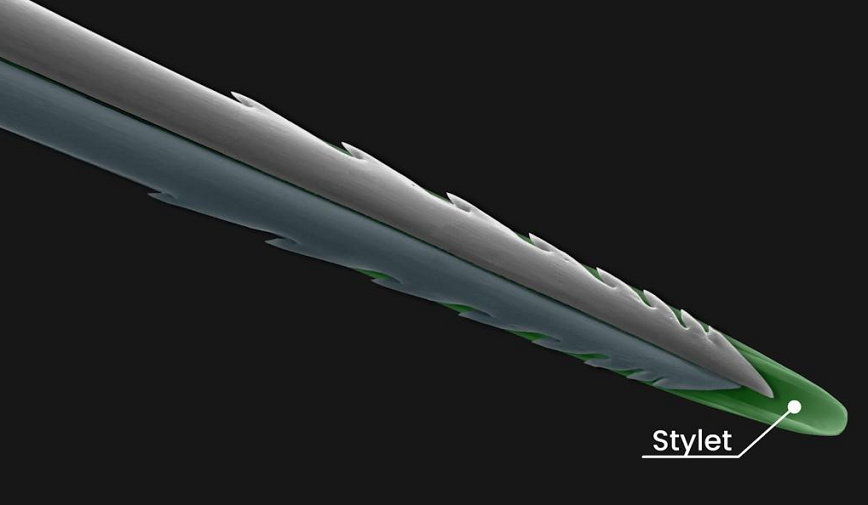 Τα πλάνα δείχνουν σε γράφημα το κεντρί, το οποίο έχει μια πολύπλοκη δομή, ενώ μοιάζει σαν σπαθί με οδοντωτές λεπίδες. «Οι λεπίδες τραβούν προς τα κάτω τη σάρκα», γιατί οι οδοντωτές άκρες στο κεντρί έχουν σχεδιαστεί για να σκάβουν όσο το δυνατόν πιο βαθιά στο δέρμα του θύματος. Έτσι, όσο περισσότερο παραμένει το κεντρί στο δέρμα, τόσο περισσότερο δηλητήριο απελευθερώνεται.