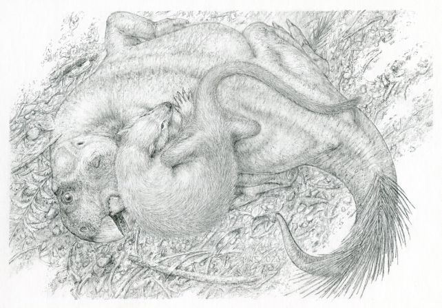 Τα δύο ζώα βρίσκονται κλειδωμένα σε μία θανάσιμη μάχη και είναι το πρώτο στοιχείο που δείχνει μία θηρευτική συμπεριφορά από ένα θηλαστικό προς ένα δεινόσαυρο. Η συνύπαρξη αυτών των δύο ζώων δεν είναι νέα, αλλά αυτό που είναι νέο για την επιστήμη μέσα από αυτό το εκπληκτικό απολίθωμα είναι η θηρευτική συμπεριφορά που απεικονίζει.