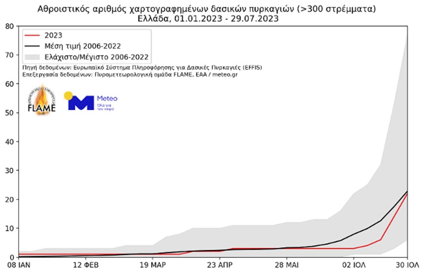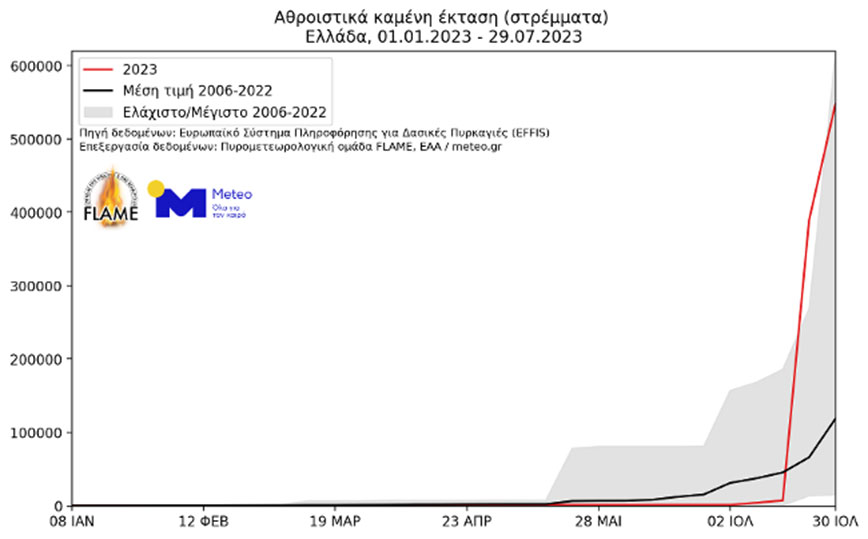 Τα περίπου 550.000 στρέμματα καμένων εκτάσεων από την αρχή του 2023 είναι ήδη κατά 30% περισσότερα των συνολικών εκτάσεων που κατά μέσο όρο καίγονται στη χώρα μας (~435.000 στρέμματα) ετησίως, όπως προκύπτει από την ανάλυση των δεδομένων του Ευρωπαϊκού Παρατηρηρίου για Δασικές Πυρκαγιές για την περίοδο 2006 – 2022. Είναι επίσης αξιοσημείωτο ότι ο αριθμός των δασικών πυρκαγιών που εκδηλώθηκαν και χαρτογραφήθηκαν στη χώρα μας έως την 30.07.2023 δεν παρουσιάζει κάποια σημαντική αύξηση.