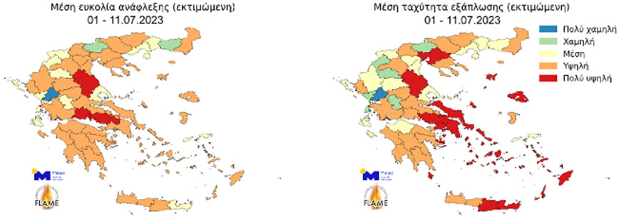 Σε ό,τι αφορά τις 7 μεγάλες δασικές πυρκαγιές του Ιουλίου 2023, είναι εύκολο να παρατηρήσει κανείς ότι κατά την εκδήλωση τους και την κύρια φάση εξάπλωση τους, οι αντίστοιχοι νομοί που επηρεάστηκαν βρίσκονταν σε υψηλή ή/και πολύ υψηλή εκτιμώμενη ευκολία ανάφλεξης και ταχύτητα εξάπλωσης.