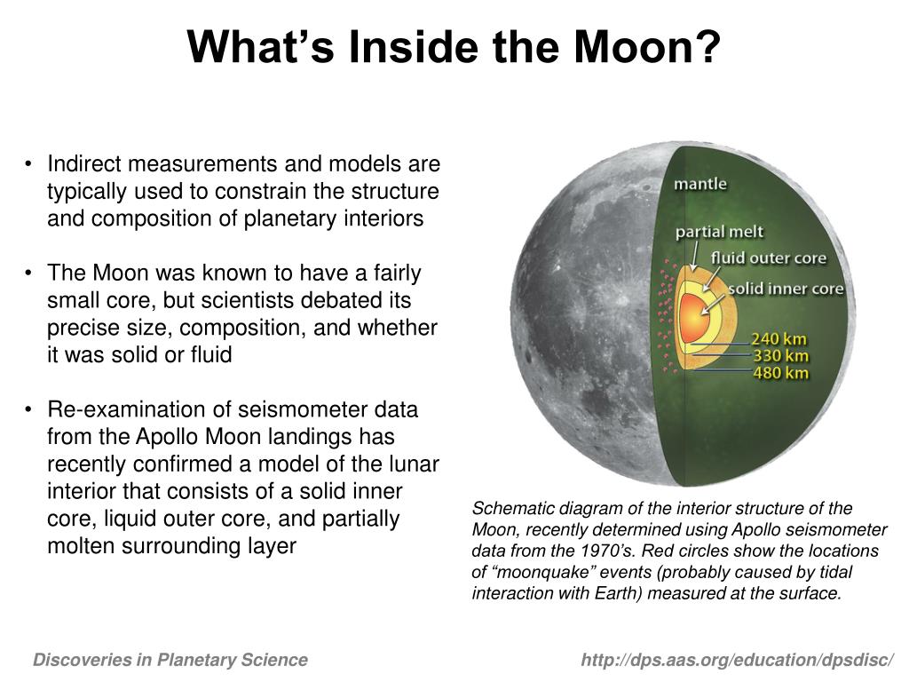Το μοντέλο αυτό προέκυψε καθώς οι επιστήμονες προσπαθούσαν να εξηγήσουν τις παράξενες μετρήσεις από ένα σύνολο σεισμικών σταθμών που εγκατέστησαν οι αποστολές Apollo και παρέμειναν λειτουργικοί από το 1972 έως το 1977. Η καλύτερη εξήγηση που βρήκαν για αυτές τις μετρήσεις σε συνδυασμό με παλιρροιακά φαινόμενα, είναι ένα εν μέρει λιωμένο, πυκνό στρώμα στα σύνορα μανδύα και πυρήνα.