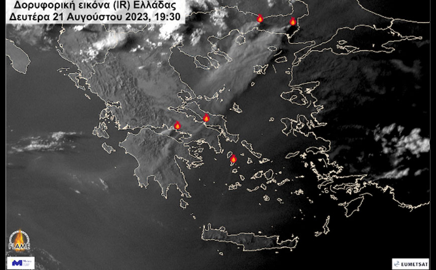 Στη φωτογραφία του ευρωπαϊκού δορυφόρου METEOSAT-11 αποτυπώνεται η δριμύτητα και η έκταση των δασικών πυρκαγιών που εκδηλώθηκαν τη Δευτέρα 21/8 και παρέμεναν παραμένουν ενεργές έως και τις 19:30 που τραβήχτηκε.