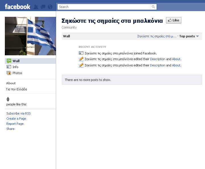 Σημαίες που έχουν αντικαταστήσει τις κομματικές και οτιδήποτε σχετικό. Ένας αναγνώστης μας έστειλε το γκρουπ που έχει δημιουργήσει στο facebook με τίτλο «Σηκώστε τις σημαίες στα μπαλκόνια» παροτρύνοντας όλους τους ‘Ελληνες να κάνουν το ίδιο.
