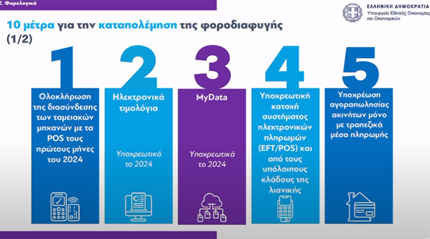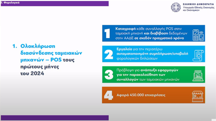 - Ολοκληρώνεται τους πρώτους μήνες του 2024 η διασύνδεση των ταμειακών μηχανών με τα POS. Αφορά σε περίπου 450.000 επιχειρήσεις.