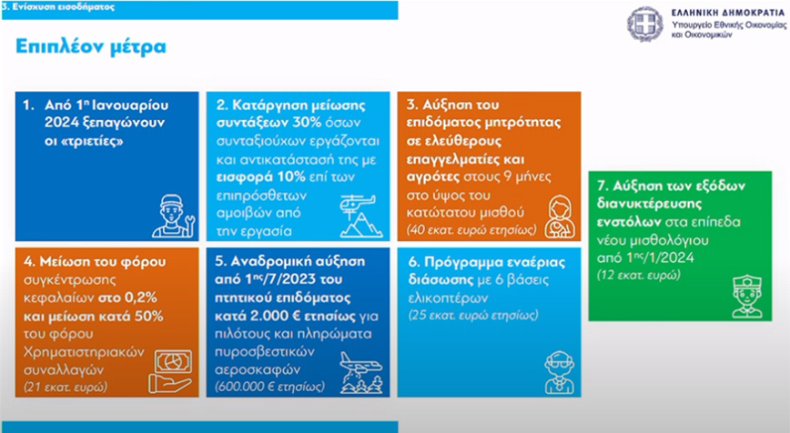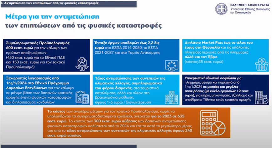 Το κόστος των νέων μέτρων για τη διετία 2023- 2024 ανέρχεται σε 1 δισ. ευρώ και συνολικά για την περίοδο αυτή σε 2,5 δισ. ευρώ, χωρίς τις αποζημιώσεις για τις φυσικές καταστροφές.