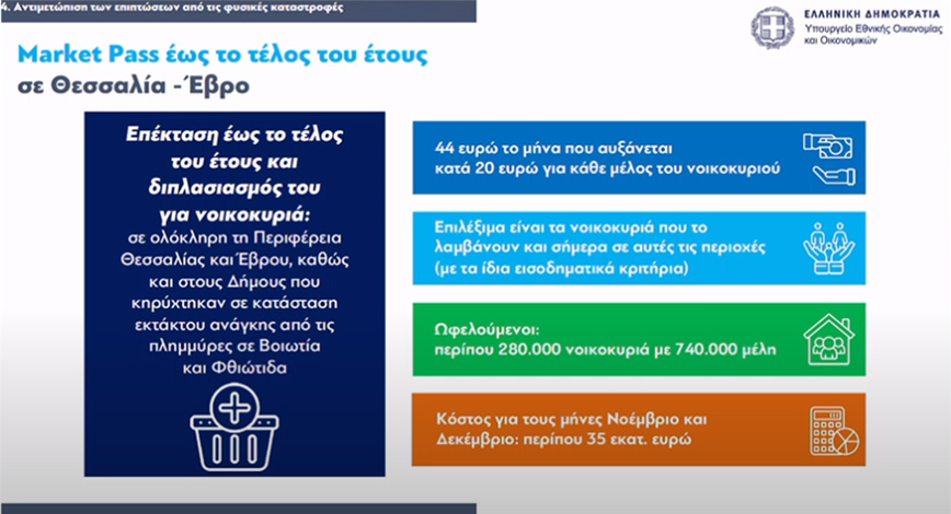 - Επέκταση της κάρτας αγορών (market pass) έως το τέλος του έτους για τις πληγείσες περιοχές του Έβρου και της Θεσσαλίας, με αύξηση στα 44 ευρώ.