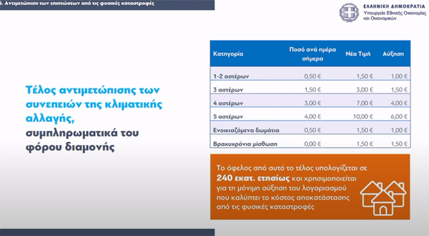 *Τέλος κλιματικής αλλαγής, συμπληρωματικό του τέλους διαμονής, και στις βραχυχρόνιες μισθώσεις, με όφελος 240 εκατ. ευρώ ετησίως.