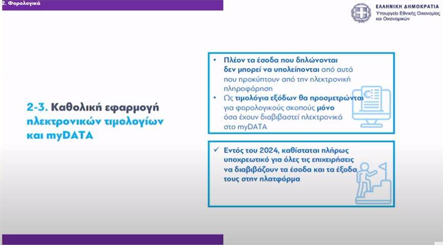 - Υποχρεωτικά καθίστανται τα ηλεκτρονικά τιμολόγια από το 2024. Τα έσοδα δεν θα μπορούν να υπολείπονται αυτών που δηλώνονται στην ηλεκτρονική πλατφόρμα. Τα τιμολόγια εξόδων θα προσμετρώνται μόνο εάν έχουν διαβιβαστεί στο MyData.