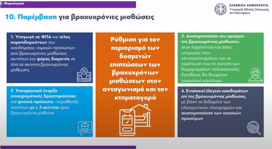 *Αυστηριοποίηση του ορισμού της βραχυχρόνιας μίσθωσης. Π.χ. σε περίπτωση που διατίθεται το σύνολο των διαμερισμάτων μιας πολυκατοικίας, θα θεωρείται τουριστικό κατάλυμα.