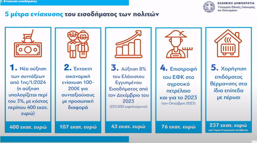 - Νέα αύξηση των συντάξεων περίπου 3% από 1/12024, με κόστος 400 εκατ. ευρώ.