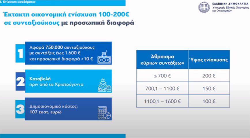 - Έκτακτη ενίσχυση 100- 200 ευρώ σε συνταξιούχους με προσωπική διαφορά. Αφορά σε περίπου 250.000 άτομα, με δημοσιονομικό κόστος 107 εκατ. ευρώ.