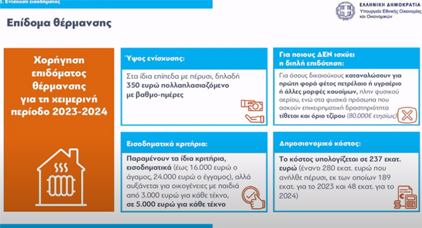 - Το επίδομα θέρμανσης θα είναι όπως και πέρυσι, με δύο διαφορές: Για κάθε τέκνο το επίδομα αυξάνεται από 3.000 σε 5.000 ευρώ, ενώ θα δικαιούνται και οι ελεύθεροι επαγγελματίες με ετήσιο τζίρο έως 80.000 ευρώ. Δεν θα υπάρξει επιδότηση στην αντλία και το μέτρο δεν θα είναι οριζόντιο, αλλά θα αφορά μόνο σε όσους έχουν πραγματικά ανάγκη.