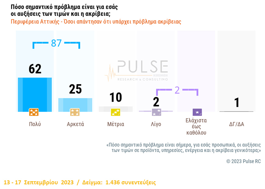 Την επιρροή της ακρίβειας στην καθημερινότητα, την οποία μάλιστα η συντριπτική πλειονότητα θεωρεί ως σημαντικό πρόβλημα, αποτυπώνει η νέα μεγάλη έρευνα από την PulseRC σε συνεργασία και για λογαριασμό του Επαγγελματικού Επιμελητήριου Αθηνών, στην περιφέρεια Αττικής.
