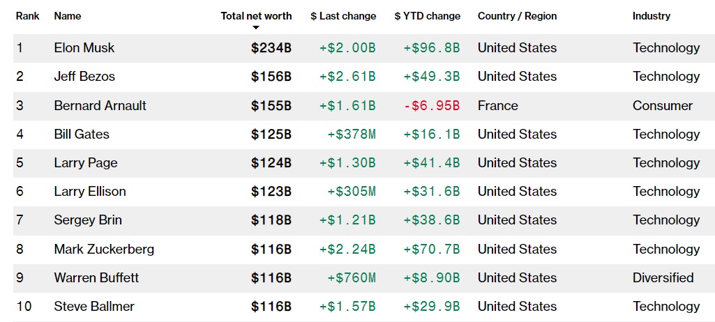 Η τεχνολογική έκρηξη έχει ευνοήσει τους μεγιστάνες του χώρου, οι οποίοι βλέπουν την περιουσία τους να εκτοξεύεται. Ενδεικτικά η περιουσία του Μασκ αυξήθηκε φέτος κατά 96,8 δισεκατομμύρια δολάρια, ενώ του Μπέζος κατά 49,3 δισεκατομμύρια δολάρια. Είναι επίσης χαρακτηριστικό πως οι 8 από τους 10 πλουσιότερους ανθρώπους είναι από τον χώρο της τεχνολογίας.