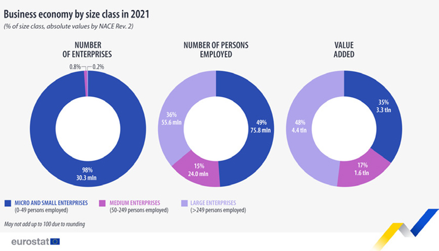 Ειδικότερα, το 2021 η ΕΕ είχε 31 εκατομμύρια επιχειρήσεις, που απασχολούσαν 156 εκατομμύρια άτομα. Από αυτό το σύνολο, το 98% (30,3 εκατομμύρια) ήταν πολύ μικρές και μικρές επιχειρήσεις, με την καθεμία να απασχολεί έως και 49 άτομα. Συνδυαστικά, πολύ μικρές και μικρές επιχειρήσεις απασχολούσαν 75,8 εκατομμύρια εργαζόμενους, δηλαδή το 49% του συνολικού αριθμού όλων όσων απασχολούνται στις επιχειρήσεις.
