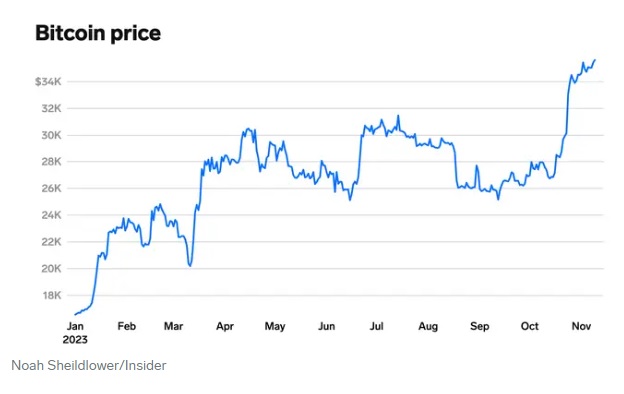 Το κρυπτονόμισμα, το οποίο παραμένει το μεγαλύτερο ψηφιακό περιουσιακό στοιχείο βάσει της συνολικής κεφαλαιοποίησης της αγοράς, έχει υπερδιπλασιαστεί σε τιμή από τότε που κατέρρευσε η αυτοκρατορία κρυπτογράφησης του Sam Bankman-Fried. Η τιμή του εκτοξεύτηκε κατά 105% τους τελευταίους 12 μήνες φτάνοντας σε λίγο λιγότερο από 37.000 δολάρια.