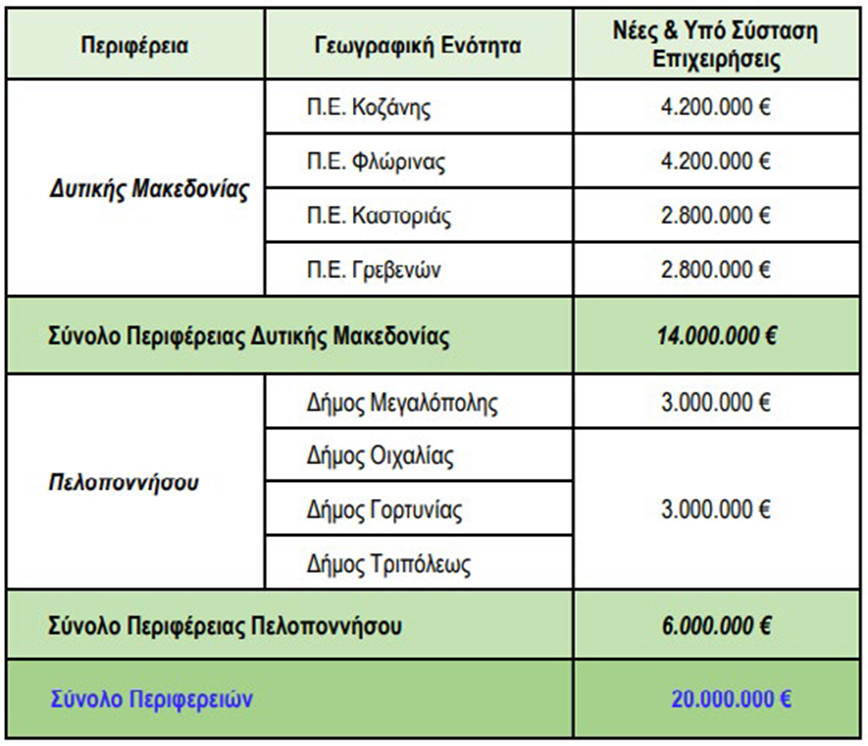 Σύμφωνα με τη σχετική προδημοσίευση, συνολικός προϋπολογισμός (δημόσια δαπάνη) της δράσης ανέρχεται σε 20 εκατ. ευρώ, ενώ όσον αφορά την κατανομή των πόρων ανά περιφέρεια, αυτή έχει ως εξής: