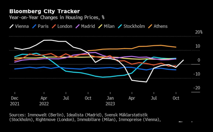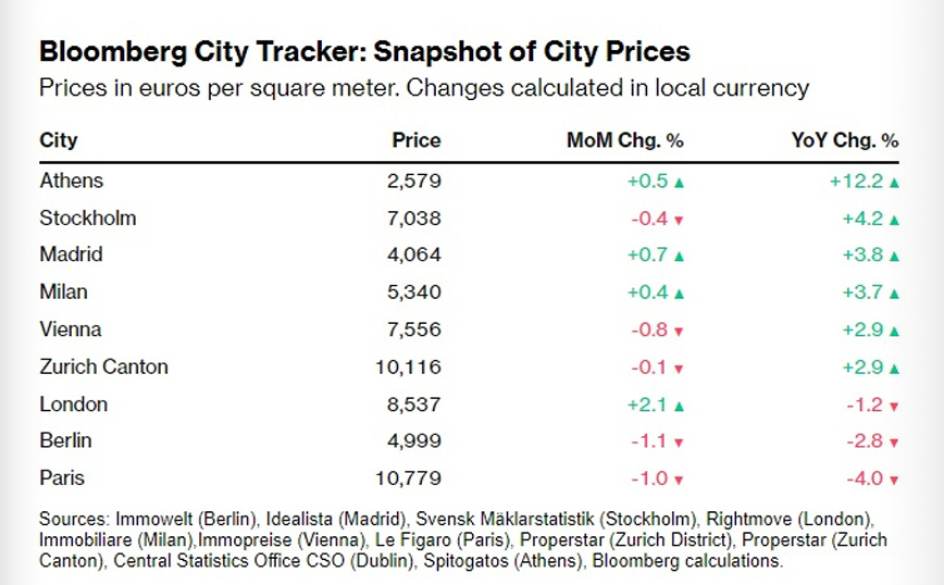 Το Λονδίνο, το Παρίσι και το Βερολίνο καταγράφουν πτώση στα τελευταία μηνιαία στοιχεία τους, ωστόσο στις περισσότερες πόλεις που παρακολουθεί το «Bloomberg City Tracker» οι τιμές αυξάνονται. Στο Μιλάνο, τη Μαδρίτη και τη Στοκχόλμη οι αυξήσεις ξεπερνούν το 3%, όμως πουθενά αλλού δεν καταγράφεται τόσο μεγάλη αύξηση όσο στην Αθήνα.