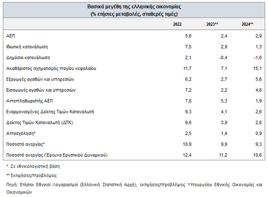 Σύμφωνα με το κείμενο του προϋπολογισμού, σε αυτό το δυσμενές και αβέβαιο διεθνές περιβάλλον, η ελληνική οικονομία αποδεικνύεται ανθεκτική. Ο ρυθμός ανάπτυξης παραμένει πλησίον των στόχων που έχουν τεθεί στο Πρόγραμμα Σταθερότητας του Απριλίου 2023 και αναμένεται να ανέλθει σε 2,4% το 2023 και 2,9% το 2024. Το Ακαθάριστο Εγχώριο Προϊόν σε ονομαστικούς όρους αναμένεται να αυξηθεί από 206,6 δισ. ευρώ το 2022 σε 222,8 δισ. ευρώ το 2023 και 233,8 δισ. ευρώ το 2024. Παράλληλα, ο Εναρμονισμένος Δείκτης Τιμών Καταναλωτή αναμένεται να κυμανθεί σε ελαφρώς χαμηλότερα επίπεδα και να διαμορφωθεί σε 4,1% έναντι 4,5% που προβλεπόταν στο Πρόγραμμα Σταθερότητας για το 2023 και να αποκλιμακωθεί περαιτέρω σε 2,6% για το 2024. Οι επενδύσεις αναμένεται να αυξηθούν κατά 7,1% κατά το τρέχον έτος και ακόμη περισσότερο κατά 15,1% το 2024, ενώ η ανεργία αναμένεται να μειωθεί από 11,2% το 2023 σε 10,6% το 2024.