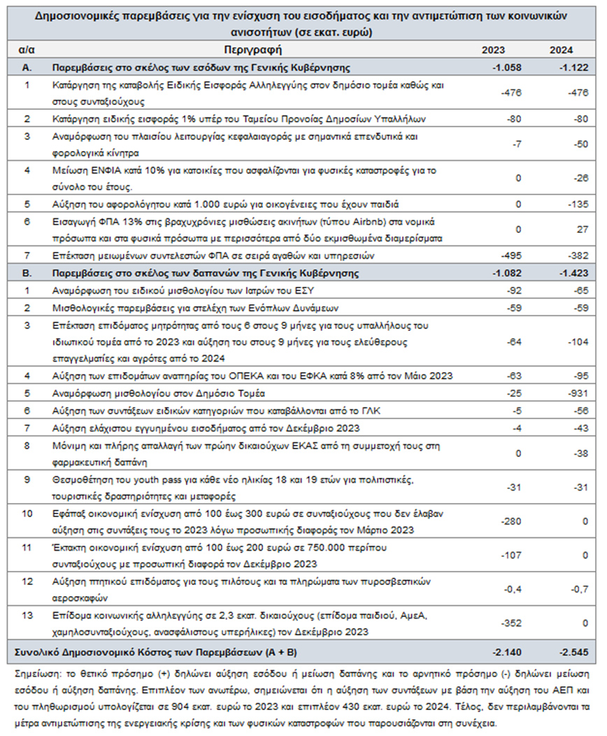 Μετά τις διπλές εκλογές του Μαΐου – Ιουνίου 2023, τον σχηματισμό κυβέρνησης τον Ιούνιο 2023 και τις προγραμματικές δηλώσεις, εξαγγέλθηκε πλέγμα παρεμβάσεων, που αφορούσε στο δεύτερο εξάμηνο του έτους 2023 και το 2024, για την τόνωση του διαθέσιμου εισοδήματος και τη μείωση των ανισοτήτων. Ειδικότερα, προβλέφθηκαν τα παρακάτω μέτρα: