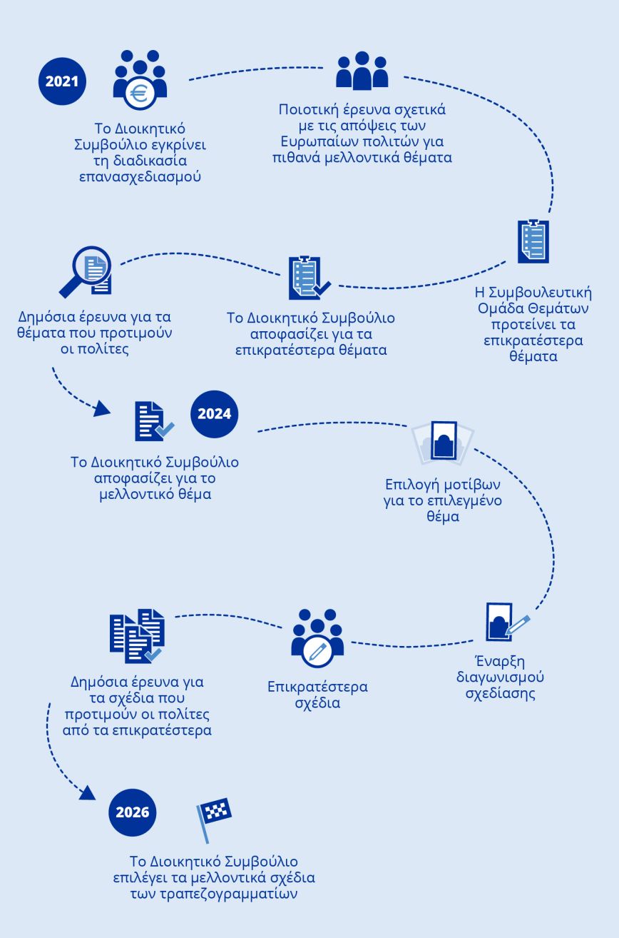 Το Διοικητικό Συμβούλιο αποφάσισε να συγκροτήσει μια συμβουλευτική ομάδα η οποία θα προτείνει μοτίβα για τα επιλεγμένα θέματα μέχρι το τέλος του 2024. Στη συνέχεια, θα διεξαχθεί διαγωνισμός για τον σχεδιασμό των νέων τραπεζογραμματίων και οι Ευρωπαίοι πολίτες θα έχουν και πάλι την ευκαιρία να εκφράσουν τις προτιμήσεις τους για τις επιλογές σχεδίων.