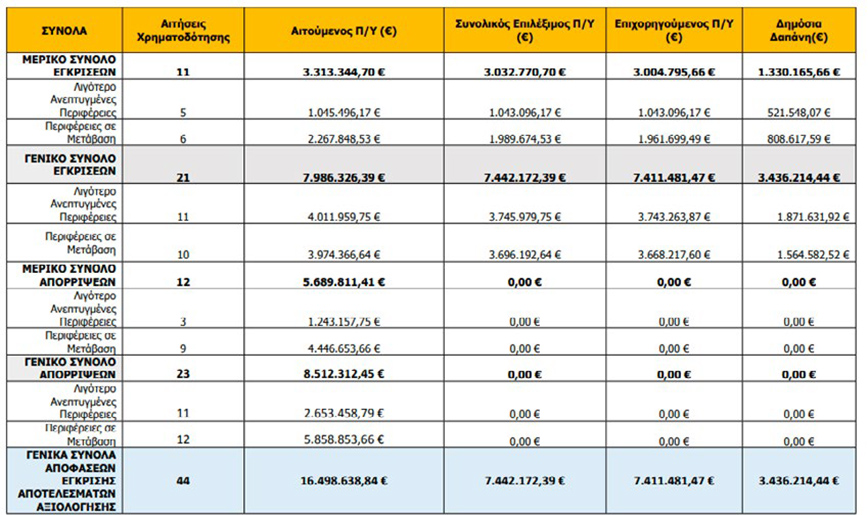 Με την απόφαση, τα συνολικά εγκεκριμένα έργα στη δράση ανέρχονται σε είκοσι 21, με συνολική επιλέξιμη δημόσια δαπάνη 3.463.214,44 ευρώ και το σύνολο των αιτήσεων για τις οποίες έχουν εκδοθεί αποτελέσματα αξιολόγησης στη δράση ανέρχονται σε 44 αιτήσεις χρηματοδότησης, συνολικού αιτούμενου προϋπολογισμού 16.498.638,84 ευρώ.