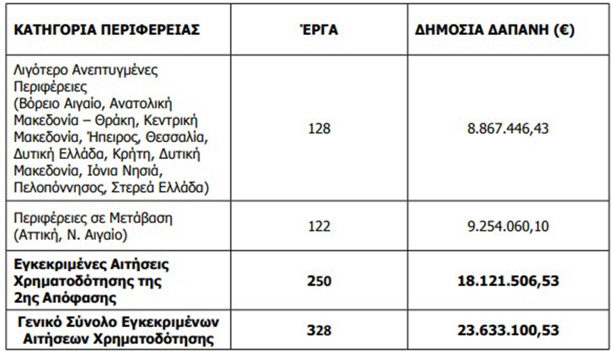 Με την απόφαση, τα συνολικά εγκεκριμένα έργα στη δράση ανέρχονται σε 328, με συνολική επιλέξιμη δημόσια δαπάνη 23.633.100,53 ευρώ και το σύνολο των αιτήσεων για τις οποίες έχουν εκδοθεί αποτελέσματα αξιολόγησης στη δράση ανέρχονται σε 406 αιτήσεις χρηματοδότησης, συνολικού αιτούμενου προϋπολογισμού 64.236.636,51 ευρώ.