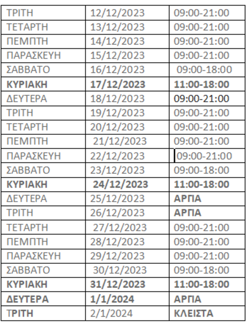 Το προτεινόμενο από τον Εμπορικό Σύλλογο Αθηνών ωράριο λειτουργίας των εμπορικών καταστημάτων για την εορταστική περίοδο των Χριστουγέννων έχει ως εξής: