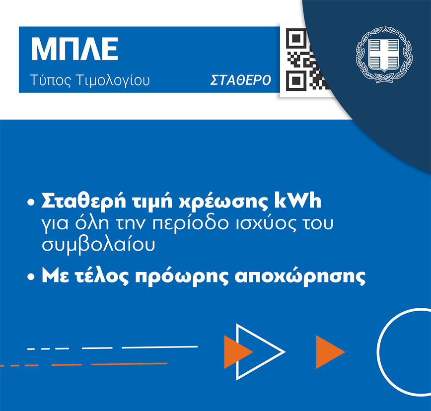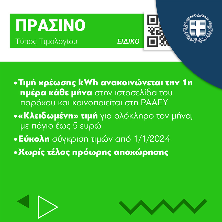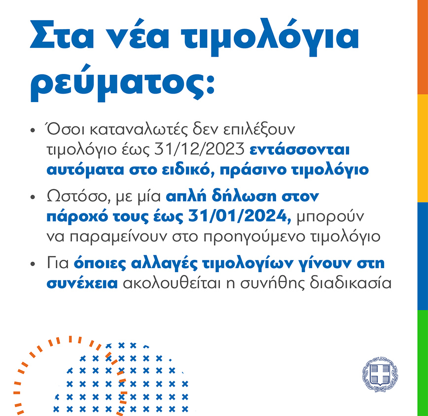 Σε αυτά τα τιμολόγια προσθέτουμε ειδικό τιμολόγιο, πράσινου χρώματος, που το ειδικό χαρακτηριστικό του είναι πως η δομή του θα είναι απλή και κοινή, επιτρέποντας τη συγκρισιμότητα, για όλους τους παρόχους. Σε αυτό θα μεταπέσουν όλοι οι καταναλωτές, την 1η Ιανουαρίου του 2024, οι οποίοι δεν θα έχουν επιλέξει -μέσα στο 2023- κάποιο συγκεκριμένο είδος τιμολογίου για τη μετάβασή τους την 1.1.2024. Ωστόσο, με μία απλή δήλωση στον πάροχό τους έως 31/01/2024, μπορούν να παραμείνουν στο προηγούμενο τιμολόγιο. Επίσης, για όποιες αλλαγές τιμολογίων γίνουν στη συνέχεια ακολουθείται η συνήθης διαδικασία. Σημειώνεται πως το ειδικό, πράσινο τιμολόγιο, που θα διατίθεται από κάθε πάροχο, θα είναι ομοιόμορφο για όλους τους παρόχους.