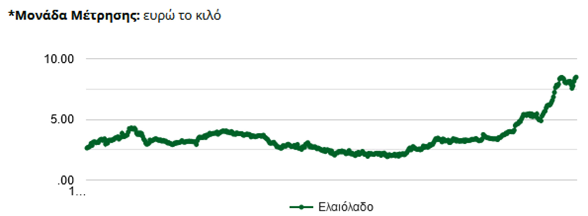 Ενδεικτικά, στην Ελλάδα, παραγωγοί στη Λακωνία έκλεισαν συμφωνία για πώληση έξτρα παρθένου ελαιόλαδου σε τιμή 9,364 ευρώ το λίτρο, καταρρίπτοντας το προηγούμενο ρεκόρ των 9,25 ευρώ το λίτρο. Στη Μεσσηνία το λίτρο πωλείται έναντι 9 ευρώ, τον ίδιο και στην Κέρκυρα, ενώ οριακά χαμηλότερη είναι η μέση τιμή στην Κρήτη (8,9 ευρώ).