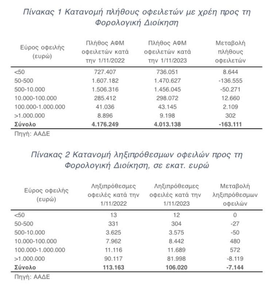 Συνολικά όμως ο αριθμός των οφειλετών μειώθηκαν κατά 163.111 πρόσωπα (φυσικά και νομικά) σε σχέση με την αντίστοιχη περίοδο του 2022 με αποτέλεσμα ο συνολικός αριθμός τους να διαμορφώνεται σήμερα σε 4.013.138, αποκλειστικά λόγω της μείωσης των οφειλετών στην κατηγορία χρεών από 50 μέχρι 10.000 ευρώ.