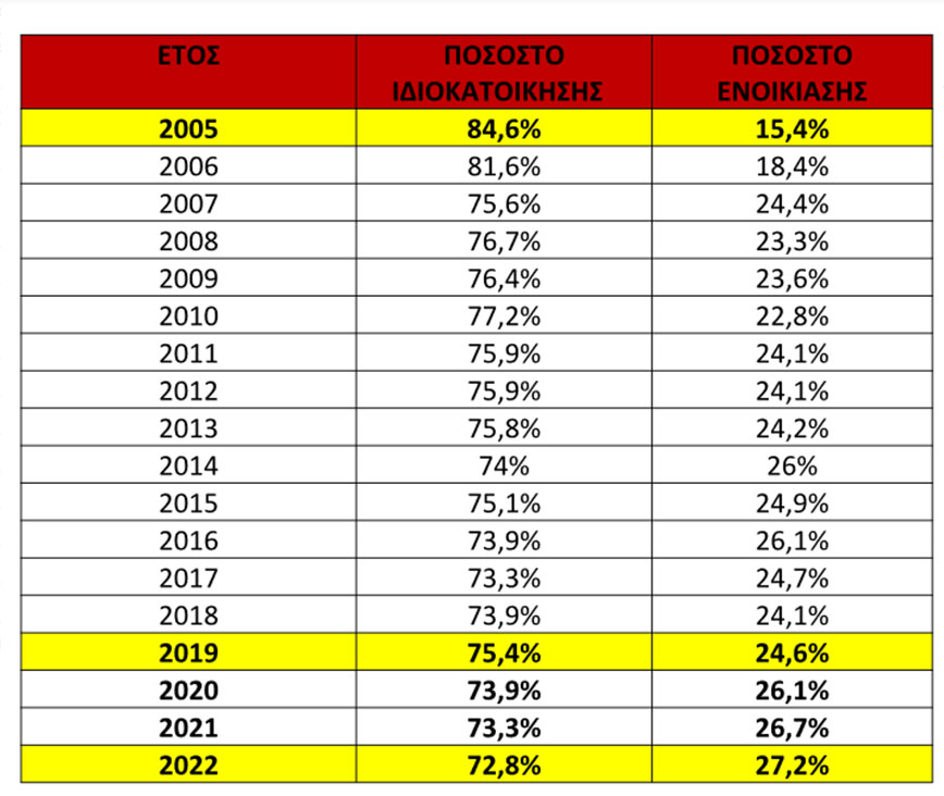 Το 2022, είναι η πρώτη χρονιά που καταγράφουμε ποσοστό ιδιοκατοίκησης μικρότερο και από τα χρόνια των μνημονίων σύμφωνα με τον άνωθεν πίνακα. Τις δύσκολες χρονιές για την Ελληνική οικονομία και κατ΄επέκταση για το σύνολο των πολιτών, όπως το 2016, 2017 και το 2018, το ποσοστό ιδιοκατοίκησης ήταν 73,9% , 73,3% και 73,9% αντίστοιχα. Στην χώρα μας δεν έχει καταγραφεί μικρότερο ποσοστό ιδιοκατοίκησης από το 2005 έως και σήμερα.