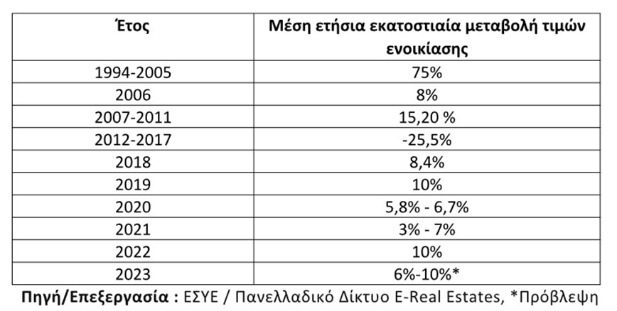 Σύμφωνα με τα στοιχεία της ΕΣΥΕ, τα ενοίκια αυξήθηκαν κατά 5 ποσοστιαίες μονάδες πάνω από τον πληθωρισμό το 2005 και κατά 5,8 ποσοστιαίες μονάδες πάνω από τον πληθωρισμό το πρώτο τρίμηνο του 2006. Ενώ από το 2007 έως και το 2011 καταγράφηκε αύξηση των ενοικίων +15,20 % , από το 2012 ως το 2017 καταγράφηκε μείωση που άγγιξε το -25,5 %, ενώ το 2018 επιστρέφουν με αύξηση +8,4 % , το 2019 ο ρυθμός αύξησης των ενοικίων άγγιξε το +10% και το 2020 κυμάνθηκε από 5,8% έως 6,7%. Η ανοδική πορεία συνεχίστηκε και το 2021 από 3% έως 7%, το 2022 άγγιξε το +10%, ενώ τη φετινή χρονιά θα καταγραφεί μεσοσταθμική αύξηση της τάξεως του 6%-10%.