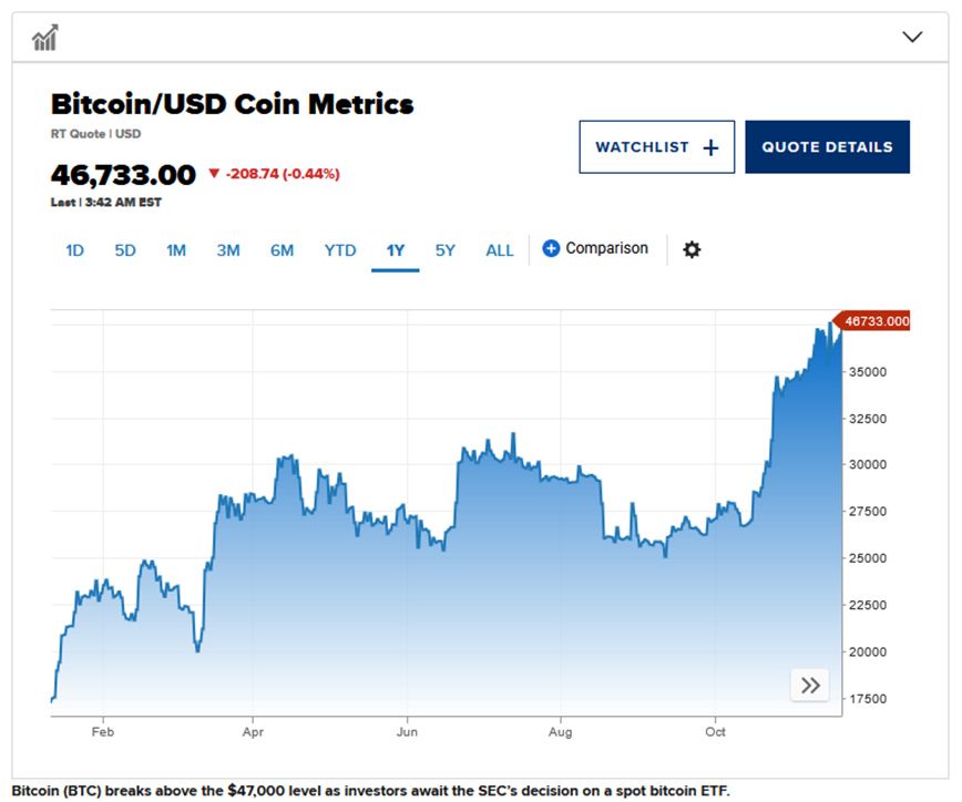 Τη Δευτέρα, το κρυπτονόμισμα βρέθηκε να σημειώνει άνοδο της τάξης του 6% στα 46.924,38 δολάρια, σύμφωνα με την Coin Metrics, καθώς οι BlackRock, Grayscale και άλλοι πιθανοί εκδότες bitcoin ETF υπέβαλαν τις τελικές ενημερώσεις στην Επιτροπή Κεφαλαιαγοράς των ΗΠΑ.