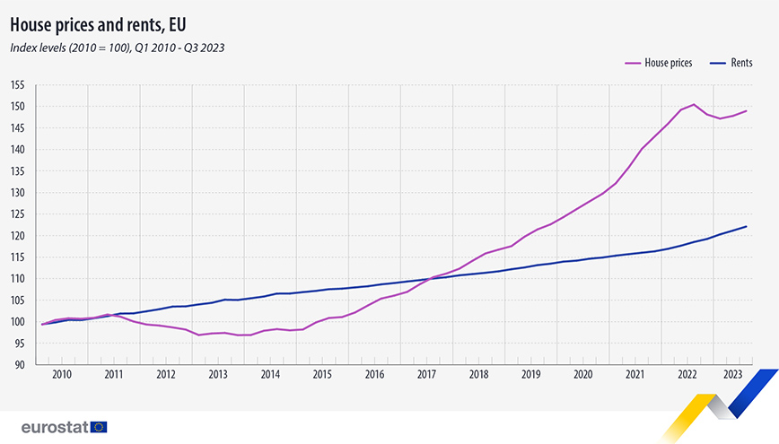 Σύμφωνα με τα στοιχεία της Eurostat, σε σύγκριση με το τρίτο τρίμηνο του 2022, οι τιμές των κατοικιών στην ΕΕ μειώθηκαν κατά -1%, ενώ τα ενοίκια αυξήθηκαν κατά 3%.