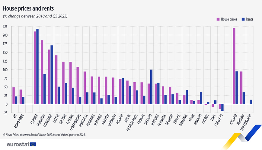 Συγκρίνοντας το τρίτο τρίμηνο του 2023 με το 2010, οι τιμές των κατοικιών αυξήθηκαν περισσότερο από τα ενοίκια σε 18 από τις 27 χώρες της ΕΕ.