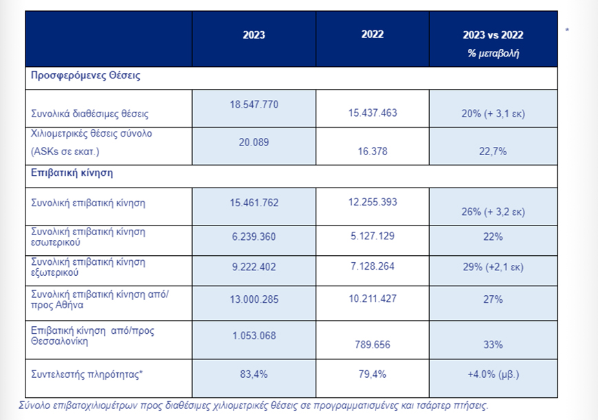 Μια ακόμη επιτυχημένη χρονιά δυναμικής ανάπτυξης ολοκληρώθηκε για την AEGEAN, η οποία προσέφερε 18,5 εκατομμύρια θέσεις το 2023, αυξημένες κατά 3,1 εκατ. συγκριτικά με το 2022, ενώ μετέφερε 15,5 εκατ. επιβάτες, αυξημένοι κατά 3,2 εκατ., επιτυγχάνοντας αύξηση της τάξεως του 26% σε σύγκριση με το προηγούμενο έτος και καταγράφοντας νέο ιστορικό υψηλό.