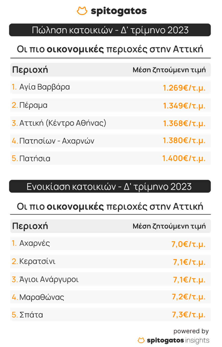 Αντίθετα, στις οικονομικότερες περιοχές για ενοικίαση κατοικίας περιλαμβάνονται οι Αχαρνές και το Κερατσίνι, ενώ για αγορά κατοικίας η Αγία Βαρβάρα και το Πέραμα.
