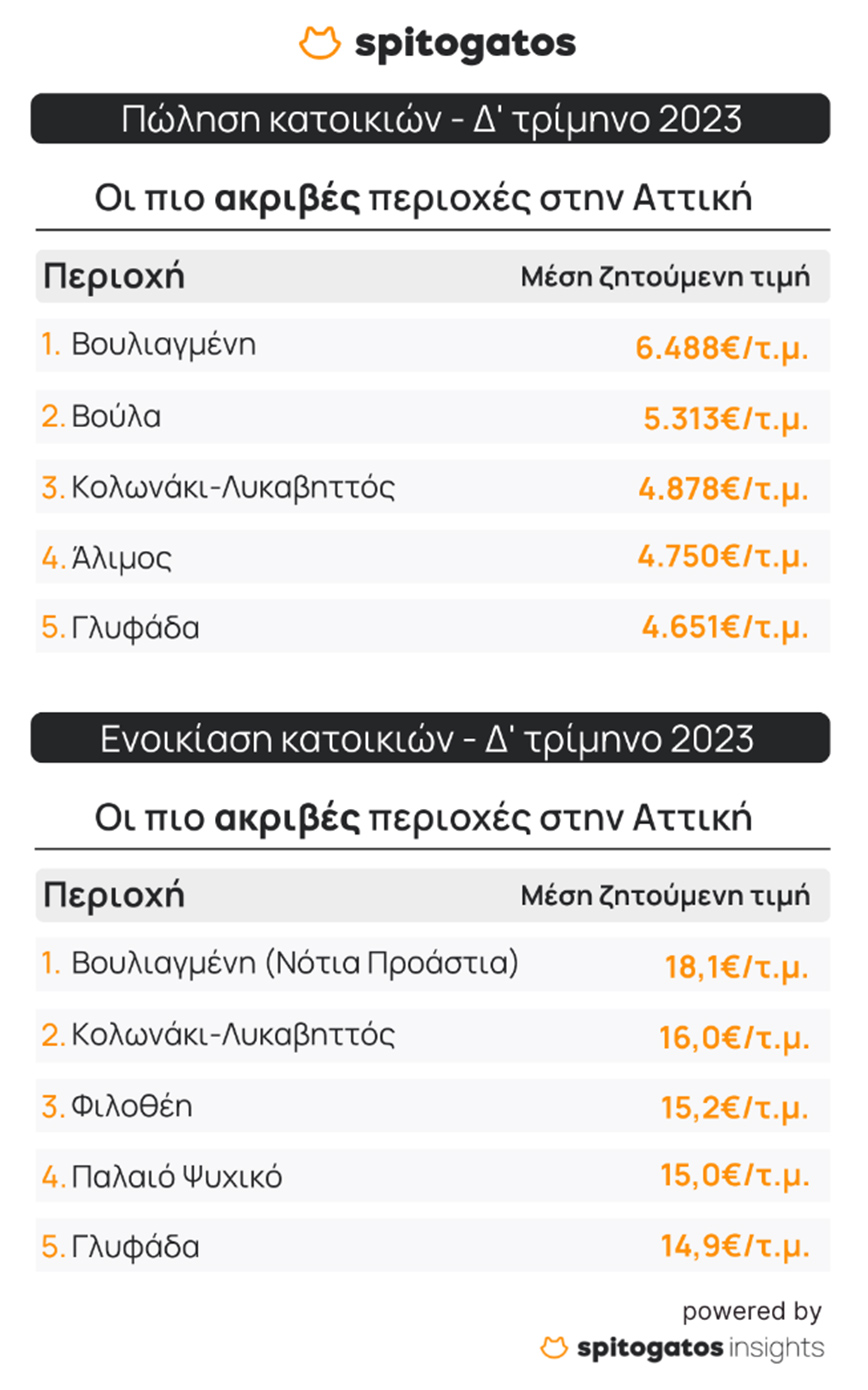 Η πιο ακριβή περιοχή της Αττικής για ενοικίαση αλλά και αγορά κατοικίας είναι η Βουλιαγμένη στα Νότια Προάστια, με μέση ζητούμενη τιμή 18,1€/τ.μ. και 6.488€/τ.μ. αντίστοιχα. Η περιοχή Κολωνάκι – Λυκαβηττός και η Γλυφάδα επίσης κατατάσσονται στις ακριβότερες περιοχές της Αττικής για ενοικίαση και για αγορά κατοικίας.