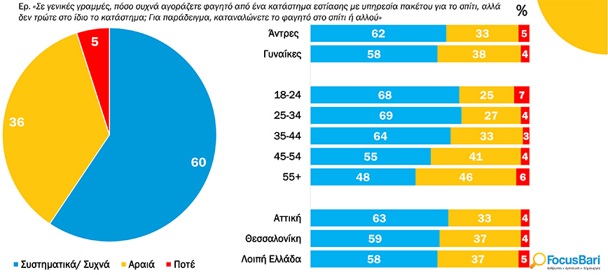 - Πάνω από ένας στους δύο Έλληνες τρώνε συστηματικά έξω, ενώ αντίστοιχα αξιοσημείωτη αναλογία αγοράζει συχνά έτοιμο φαγητό σε πακέτο ή παραγγέλνει φαγητό απ’ έξω
