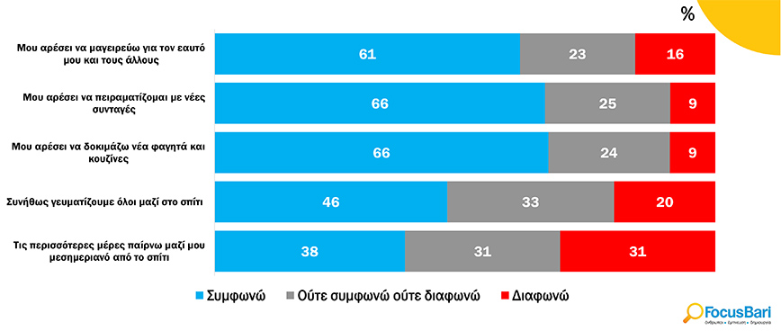 - Παράλληλα όμως, η πλειονότητα των Ελλήνων αγαπά να μαγειρεύει και να πειραματίζεται με νέες συνταγές, ενώ αναγνωρίζει τη σημαντικότητα του φαγητού με παραδοσιακό τρόπο και όλη την οικογένεια