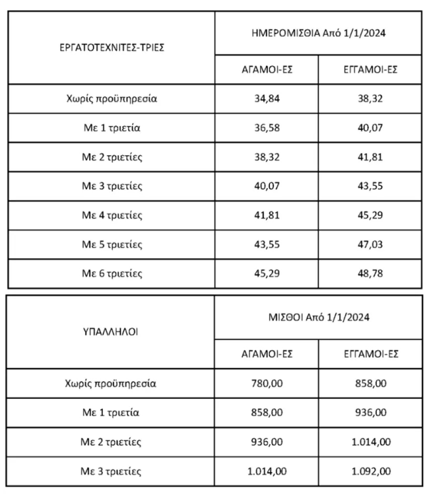 Πίνακες με τα ποσά για εργαζόμενους με τριετίες