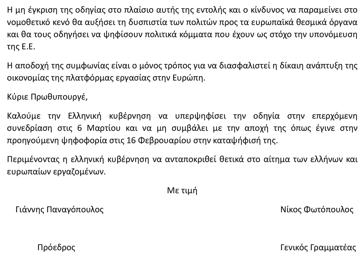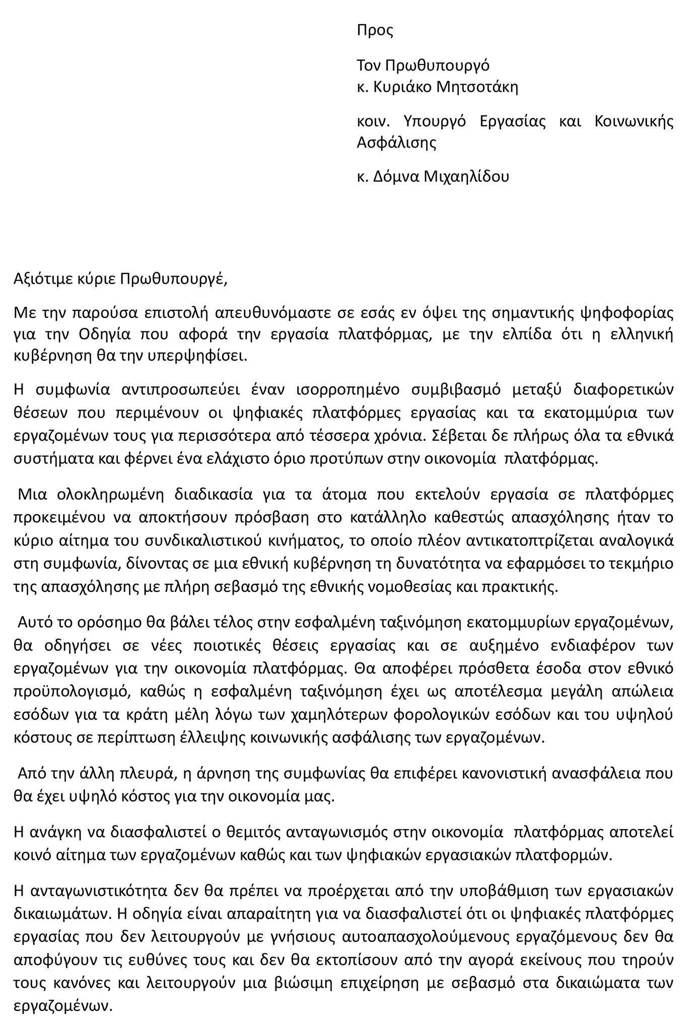 Επιστολή στον πρωθυπουργό, Κυριάκο Μητσοτάκη, την οποία κοινοποίησε και στην υπουργό Εργασίας, Δόμνα Μιχαηλίδου, απέστειλε η Γενική Συνομοσπονδία Εργατών Ελλάδας (ΓΣΕΕ), ζητώντας την υπερψήφιση από την κυβέρνηση της ευρωπαϊκής οδηγίας για την εργασία στις ψηφιακές πλατφόρμες.
