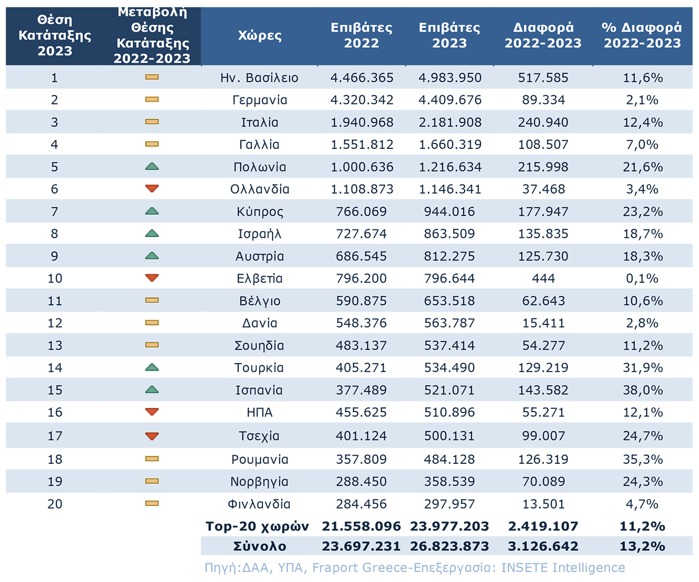 Η πεντάδα συμπληρώνεται με την Πολωνία, που ανέβηκε στην πέμπτη θέση με 1,2 εκατ. επιβάτες, παρουσιάζοντας αύξηση +216 χιλ./+21,6%. Από τις πέντε πρώτες χώρες προέρχεται το 54% των επιβατών που αφίχθησαν στην Ελλάδα το 2022.