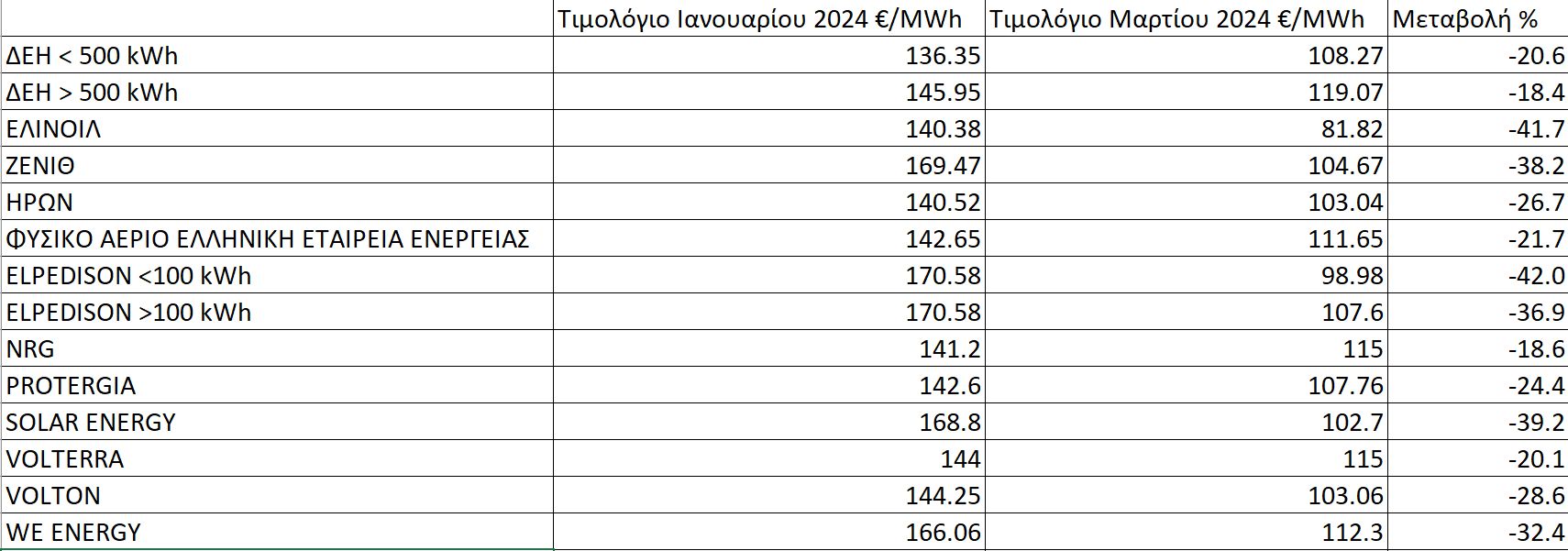 Η σύγκριση αφορά τις τιμές που χρεώνει ο ίδιος προμηθευτής, ενώ η απόκλιση ανάμεσα στο ακριβότερο και το φθηνότερο τιμολόγιο του πρώτου τριμήνου του έτους είναι ακόμα μεγαλύτερη. Με άλλα λόγια οι καταναλωτές που δεν άλλαξαν προμηθευτή στο διάστημα αυτό, για την κατανάλωση του Μαρτίου θα πληρώσουν από 18 έως 42 % χαμηλότερες τιμές σε σχέση με τον Ιανουάριο.