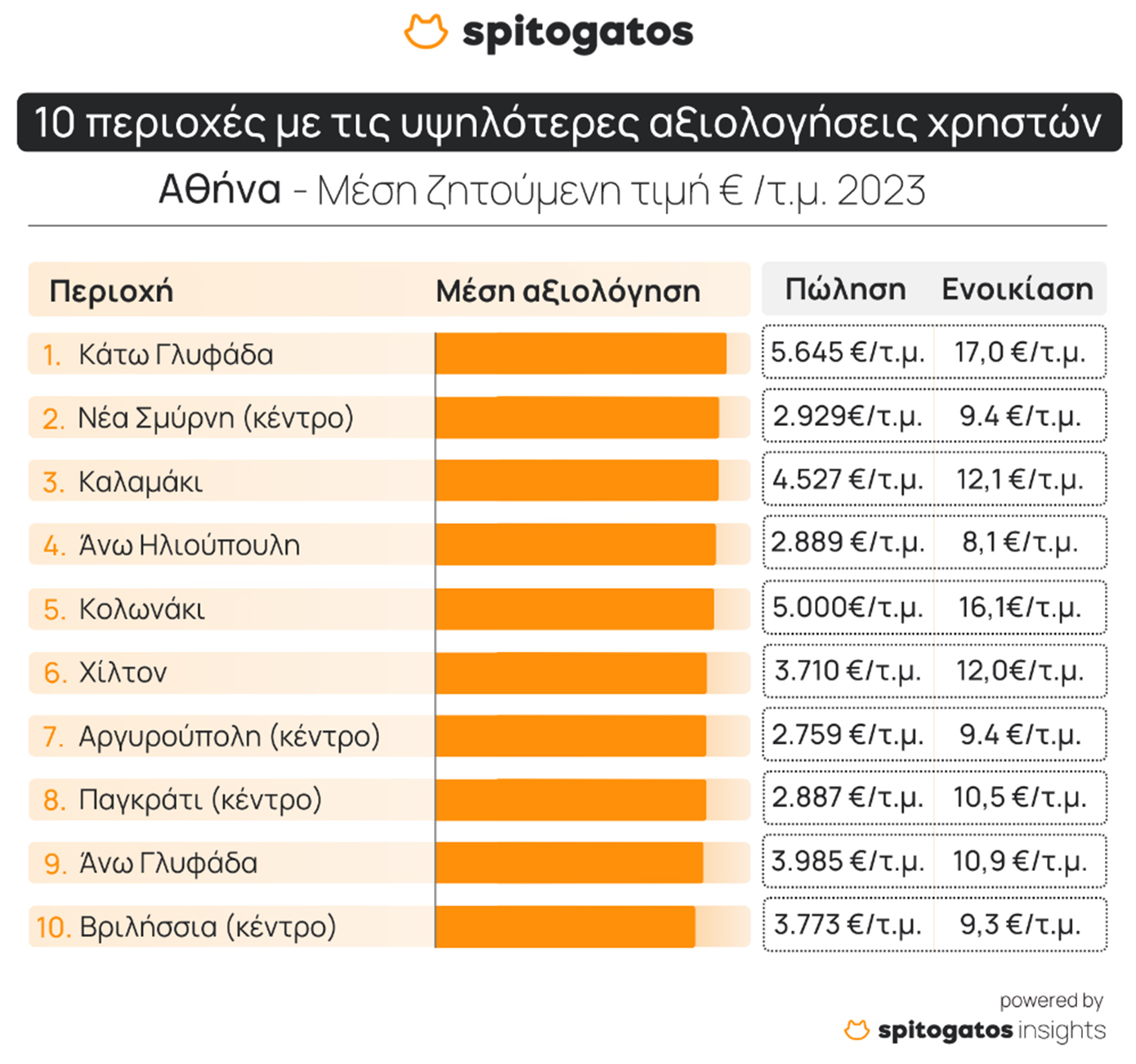 Οι συνοικίες της Αθήνας, που αξιολογήθηκαν πιο υψηλά σε σχέση με όλα τα κριτήρια της έρευνας του «Spitogatos», είναι οι ακόλουθες: η Κάτω Γλυφάδα, το κέντρο της Νέας Σμύρνης, το Καλαμάκι, η Άνω Ηλιούπολη, το Κολωνάκι, η περιοχή Χίλτον, το κέντρο της Αργυρούπολης, το κέντρο του Παγκρατίου, η Άνω Γλυφάδα και το κέντρο των Βριλησσίων.