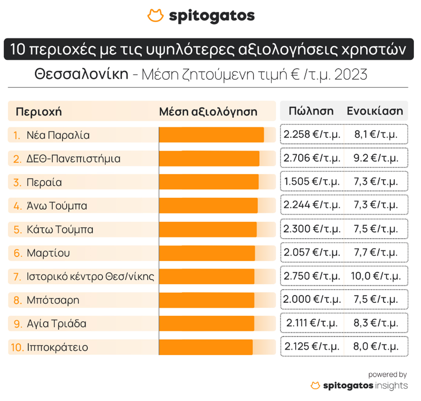 Αντίστοιχα, οι περιοχές της Θεσσαλονίκης με τις υψηλότερες αξιολογήσεις βάσει του συνόλου των κριτηρίων της έρευνας είναι η Νέα Παραλία, η περιοχή ΔΕΘ-Πανεπιστήμια, η περιοχή Περαία, η Άνω και Κάτω Τούμπα, η περιοχή Μαρτίου, το ιστορικό κέντρο της Θεσσαλονίκης, η περιοχή Μπότσαρη, η Αγία Τριάδα και η περιοχή Ιπποκράτειο.