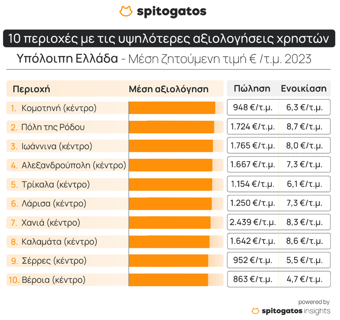 Στην υπόλοιπη Ελλάδα, οι 10 περιοχές με τις υψηλότερες αξιολογήσεις από τους χρήστες είναι το κέντρο της Κομοτηνής, η πόλη της Ρόδου, το κέντρο των Ιωαννίνων, το κέντρο της Αλεξανδρούπολης, το κέντρο των Τρικάλων, της Λάρισας, των Χανίων, της Καλαμάτας, των Σερρών και το κέντρο της Βέροιας.