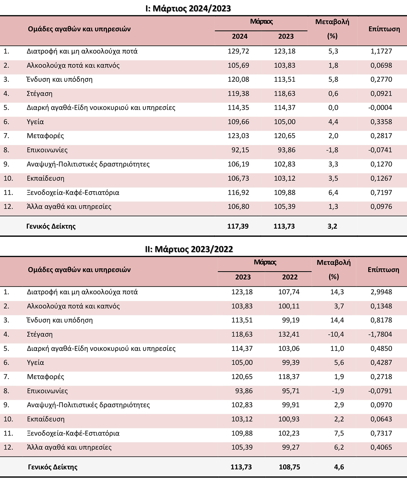 Η αύξηση του Γενικού ΔΤΚ κατά 3,2% τον μήνα Μάρτιο 2024, σε σύγκριση με τον αντίστοιχο Δείκτη του Μαρτίου 2023, προήλθε κυρίως από τις μεταβολές στις ακόλουθες ομάδες αγαθών και υπηρεσιών:
